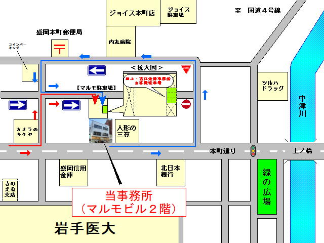 紛争相手との利害関係(利益相反)を確認する必要がありますので、匿名でのご相談はお受けできません。 弁護士は相談内容を外に漏らしません。 事務所の入口はビルの正面からは見えないところにあり、裏手から入ることもできますので、出入りを他の方に見られる心配もございません。相談中も外から見えないように工夫していますので安心してご相談下さい。 盛岡市以外の方からも広くご相談やご依頼を受けておりますので、事務所においでいただけるのであればご相談は可能です(顧問契約者の方は電話やメールでの相談も可能です)。 ただし、実際に依頼をお受けできるかどうかは事案の内容によって異なります。ご相談の結果、ご依頼をお引き受けできない場合もございますので、遠方の方はあらかじめその旨ご了承願います。 法律相談は事前予約をお願いしております。 お手数ですが、お電話(019-651-3560)か【メール予約フォーム】でのお問い合わせをお願い致します。 ご相談の内容、ご本人と同席希望者との関係、人数などによって異なりますので、あらかじめご確認ください。 同席希望者とご本人との関係や人数等によっては同席をお断りするケースがあります。 ※事前のご連絡なしに同行された場合、同席をお断りしたり相談そのものをお断りすることがあります。 ご相談の内容、ご本人との関係によって異なりますので、あらかじめご確認ください。 なお、代理相談では詳しい事情が分からないため有効なアドバイスができない可能性があり、また、ご依頼の際にはご本人との面談が必要となりますので、できる限りご本人によるご相談をお勧めします。 平日の夜間(18時30頃まで)の相談も日程上可能なときは対応していますので、お電話かメールでお問い合わせください。 なお、借金問題・債務整理については【専用WEB予約フォーム】を利用した自動予約に対応していますので、ご予定が合うときはご活用ください。 ・平日午後5時15分以降は通常業務時間外の対応につき、お電話でのお問い合わせに応答することができません。恐縮ですが当日は相談予定時刻に直接事務所までお越し下さい。 ・当日の遅延や早着、経路案内などについても電話での応答が困難となりますので、ご協力のほどお願い申し上げます。 ・夜間相談をご予約時のお問い合わせ、キャンセル等につきましては、平日の営業時間帯にお電話をいただきますようお願い申し上げます。 ※事前のご連絡なくおいでいただけなかった方(無断キャンセル)は、以後のご相談をお断りすることがあるほか、所定の相談料を請求する場合があります。 お名前、ご住所、電話番号、相談の簡単な内容、紛争等の相手方の氏名(名称)、相談希望日時(、ご紹介者がおられるときはその方のお名前(任意))、をお知らせ下さい。 一例を挙げると以下のとおりですが、資料がすべて揃っている必要はありません。ご相談の結果、必要となったときは弁護士から資料をお願いしますので、まずはお手元にある資料で関係がありそうなものは幅広くお持ち下さい。 【借金問題(債務整理)】 借入先や大まかな負債額をまとめたメモ、クレジットカードなど 【相続問題】 相続人の関係図、遺産をまとめたメモ、故人の預金通帳、故人名義の不動産の納税通知書など 【離婚問題】 夫婦の戸籍謄本、自分や相手方の財産をまとめたメモ、など 保険会社からの連絡文書など ご相談者専用の駐車場がございますので、来所の際はそちらをご利用下さい。ただし、台数に限りがありますので、満車の際は恐縮ですが近隣のコインパーキングをご利用下さい。 なお、当事務所1階の正面にある駐車場は別店舗の契約駐車場であり利用できませんので、ご注意下さい。 弁護士費用はご依頼いただく内容によって変わります。最終的には個々の事案によりますが、弁護士費用について事件ごとの目安を公表しておりますので、参考までにご覧ください。 なお、依頼を希望されるときは見積書を作成して説明し、支払額や支払方法なども協議の上で委任契約を締結致しますので、費用についてご不明な点があるときは相談の際に気兼ねなくご質問ください)。